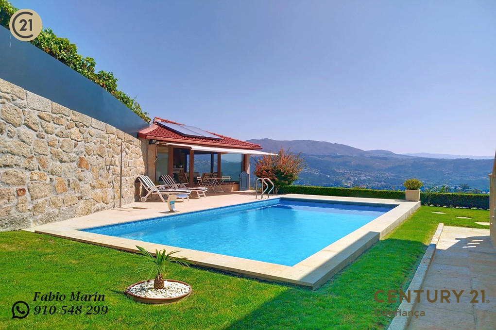 No exterior, encontra-se uma piscina com cozinha de apoio, rodeada por um cuidado jardim soalheiro, enriquecido por duas fontes de água em granito abastecidas por água potável de duas minas pertencentes á moradia. As vistas panorâmicas abertas e deslumbrantes conferem um ambiente de serenidade e amplitude.