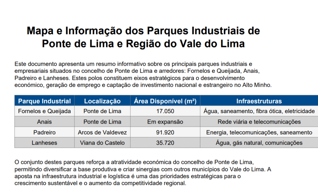 Aquà tenemos un mapa e información clave de los principales parques y polÃgonos industriales en el entorno de Ponte de Lima, con lotes disponibles, datos de infraestructura y contactos útiles para inversores.